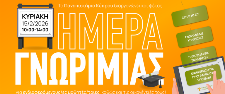 Η Υπηρεσία Σπουδών και Φοιτητικής Μέριμνας του Πανεπιστημίου Κύπρου, στο πλαίσιο ενημέρωσης των υποψήφιων προπτυχιακών φοιτητών/ριών για τα προγράμματα σπουδών και τις παρεχόμενες υπηρεσίες προς τη φοιτητική κοινότητα, διοργανώνει «Ημέρα Γνωριμίας» (Open Day), την Κυριακή 15 Φεβρουαρίου 2026, και ώρα 10.00 -14.00, στην Πανεπιστημιούπολη (κτήριο ΧΩΔ 03). Η εκδήλωση είναι ανοιχτή για το κοινό.