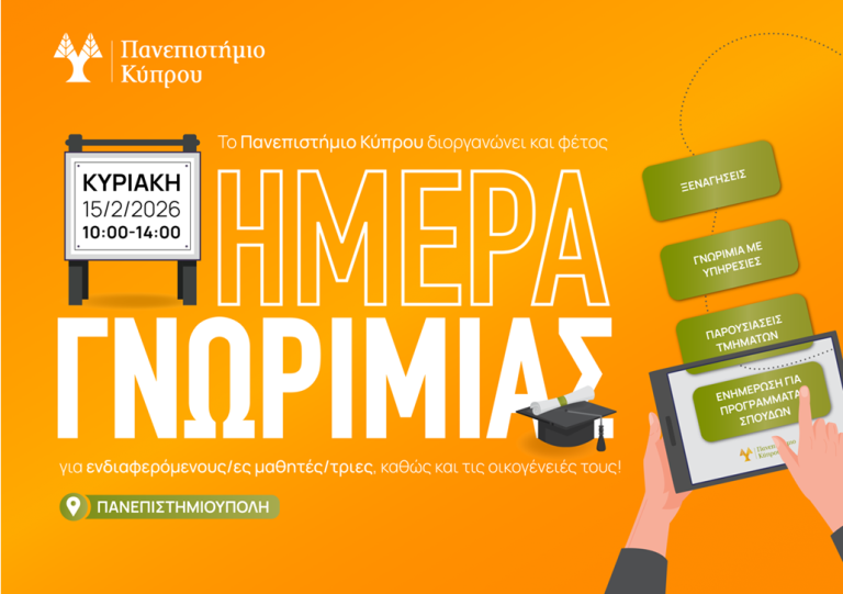 Η Υπηρεσία Σπουδών και Φοιτητικής Μέριμνας του Πανεπιστημίου Κύπρου, στο πλαίσιο ενημέρωσης των υποψήφιων προπτυχιακών φοιτητών/ριών για τα προγράμματα σπουδών και τις παρεχόμενες υπηρεσίες προς τη φοιτητική κοινότητα, διοργανώνει «Ημέρα Γνωριμίας» (Open Day), την Κυριακή 15 Φεβρουαρίου 2026, και ώρα 10.00 -14.00, στην Πανεπιστημιούπολη (κτήριο ΧΩΔ 03). Η εκδήλωση είναι ανοιχτή για το κοινό.